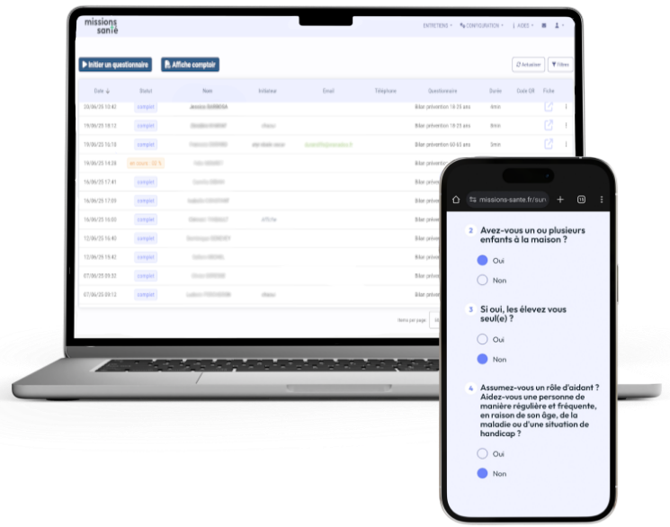 Le patient remplit le questionnaire en autonomie sur son smartphone, tablette ou un terminal en officine/cabinet.
